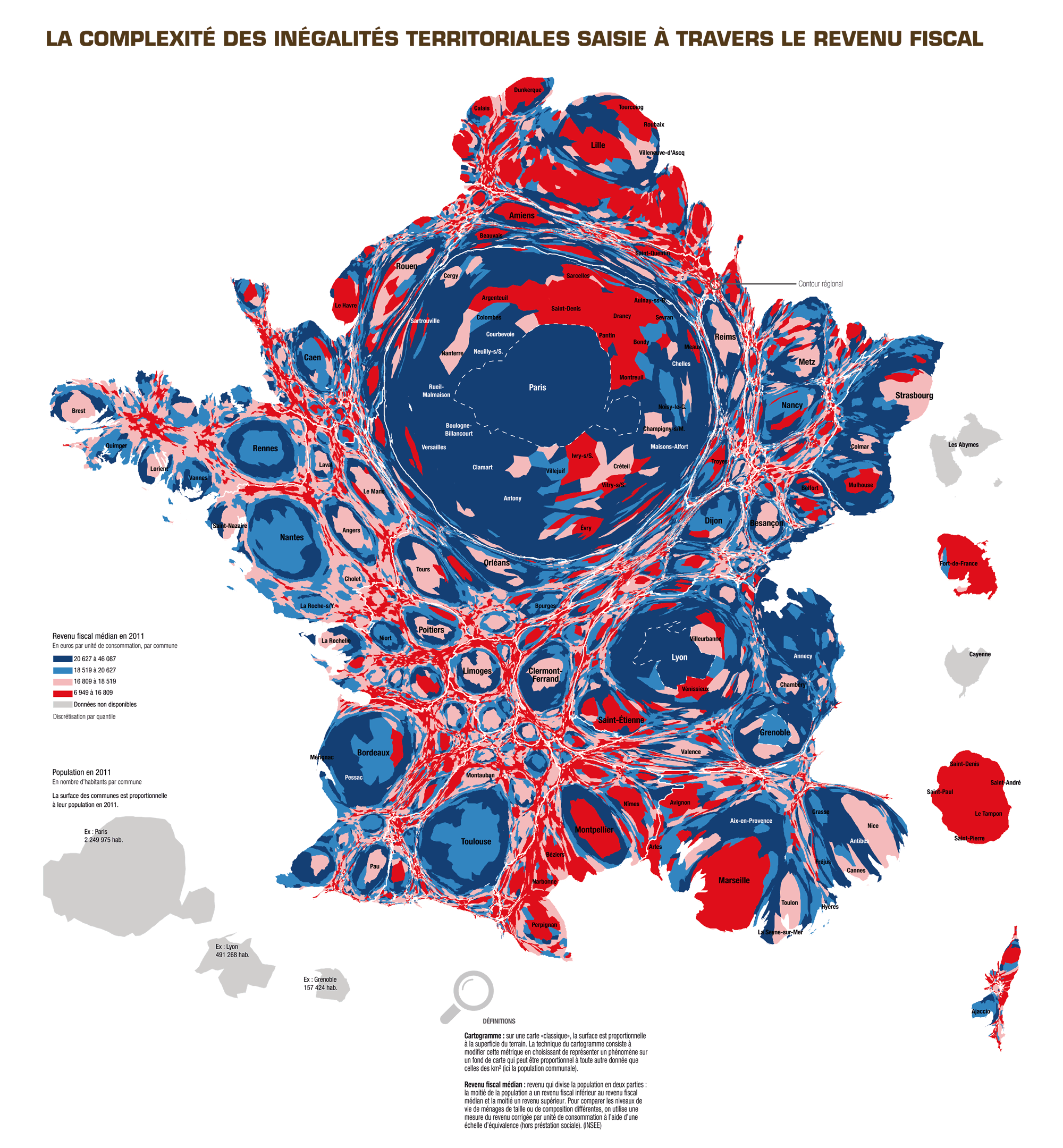 En même temps, l’accroissement des inégalités territoriales est socialement délétère. La lutte contre ces inégalités est un objectif politique prioritaire dont « l’égalité des territoires » marque l’ambition. Au prisme du revenu fiscal des ménages, on constate la force et la complexité des mécanismes de ségrégation à l’œuvre.